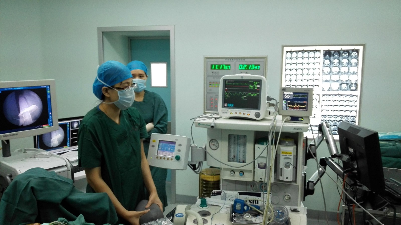患者男性,56岁,以“鼻干不适2年”来西安交大二附院就诊,经CT、MRI、局部取材等详细检查后诊断为鼻、鼻窦、眶尖腺样囊性癌。会同眼、肿瘤、麻醉等科室专家讨论后认为常规的肿瘤切除术极易导致眼球运动障碍,失明等严重并发症的发生,若能在术中准确的掌握患者的视力及眼球运动变化情况,则会将并发症的发生降到最低。最后确定实施目前最先进的全身麻醉气管插管下术中唤醒经鼻内镜眶尖肿瘤切除术。考虑到患者在术中需持续半小时以上的术中唤醒并继续手术,且患者苏醒同时还要具有良好的视力。麻醉科以薛荣亮主任为首成立了麻醉小组,进行了详细而严谨的术前讨论,并初步拟定了环甲膜穿刺配合双侧喉上神经阻滞加气管插管全麻的麻醉计划。在麻醉科吕建瑞副主任,张小琴教授,李伟副主任医师指导下,张珍妮副主任医师等实施全身麻醉。眼科熊全臣教授、耳鼻喉郑国玺副主任指导下由孙斌副教授和高滢医师成功为患者切除了鼻-鼻窦及眶尖肿瘤。手术耗时2小时30分钟,期间唤醒时长达三十分钟。唤醒期间术者继续进行手术操作,患者无明显疼痛,可完全耐受气管插管,并能正确及时地与医生配合,做出各种指令性动作,以判断眼球运动、视力等功能状况。