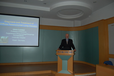 25日下午2点30分在教学楼二层讲学厅,首先由刘原副院长代表我院致欢迎辞,对两位远道而来的德国专家表示热烈的欢迎。之后Costabel教授为与会的呼吸界同仁、重症医学医生、研究生、进修生等做了“肺间质性疾病的诊治进展”“肺泡灌洗液检查的临床应用”的专题讲座,由呼吸科副主任、博士生导师李满祥教授担任现场翻译,参会人员对Costabel教授讲授内容反映热烈,积极互动交流。刘原副院长在讲座结束后代表我院为Costabel教授颁发了交大客座教授聘书,Costabel教授也将自己主编的“肺间质性疾病的诊治”专著赠送给我院,希望今后继续加强双方的交流与合作。