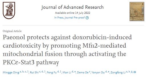 近日,我院生物诊断治疗国家地方联合工程研究中心(即“生物诊疗中心”)与干二病区(老年心血管内科)合作在Journal of Advanced Research期刊(2021 IF=12.822)上发表论著,发现丹皮酚通过激活PKCε-Stat3促进Mfn2介导的线粒体融合,从而减轻阿霉素引起的心肌毒性,且不干扰阿霉素的抗肿瘤效应。