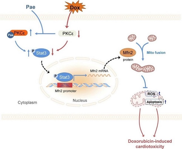 在此研究中,研究人员先采用了阿霉素处理的离体心肌细胞模型,发现阿霉素损害线粒体呼吸功能,抑制Mfn2介导的线粒体融合,丹皮酚可提高Mfn2转录并恢复线粒体融合和呼吸功能。整体动物实验发现,丹皮酚可减轻阿霉素处理动物的心肌毒性,改善心脏功能,抑制心肌凋亡和氧化应激,恢复Mfn2介导的线粒体融合并增强线粒体功能。敲低或敲除Mfn2明显削弱丹皮酚在离体细胞和整体动物改善线粒体和心脏功能的效应,表明丹皮酚通过依赖Mfn2的方式发挥线粒体和心脏保护特性。为了进一步阐明丹皮酚上调Mfn2的信号传导机制,研究人员使用了几种特异性抑制剂来阻断常见的心脏保护信号通路,发现Stat3抑制剂和PKCε抑制剂明显减弱丹皮酚诱导的Mfn2升高,且PKCε为Stat3的上游分子。敲低Stat3或PKCε具有阻断丹皮酚上调Mfn2和减轻阿霉素心肌毒性的效应。染色质免疫沉淀(ChIP)-PCR发现Stat3可与Mfn2的启动子结合,阿霉素抑制Stat3与Mfn2启动子的结合,而丹皮酚恢复两者的结合。分子对接和表面等离子共振结合分析显示,丹皮酚与PKCε之间的亲和力相对较高,PKCε可能作为Pae的植物化学配体激活Stat3-Mfn2信号通路并促进线粒体融合。最后,研究人员还评估了丹皮酚对阿霉素抗肿瘤效果的影响,发现丹皮酚本身即具有一定的抗肿瘤效应,且可增加低浓度阿霉素对B16肿瘤细胞的抑制作用,而不影响其在其它几种肿瘤细胞的抗癌效应。