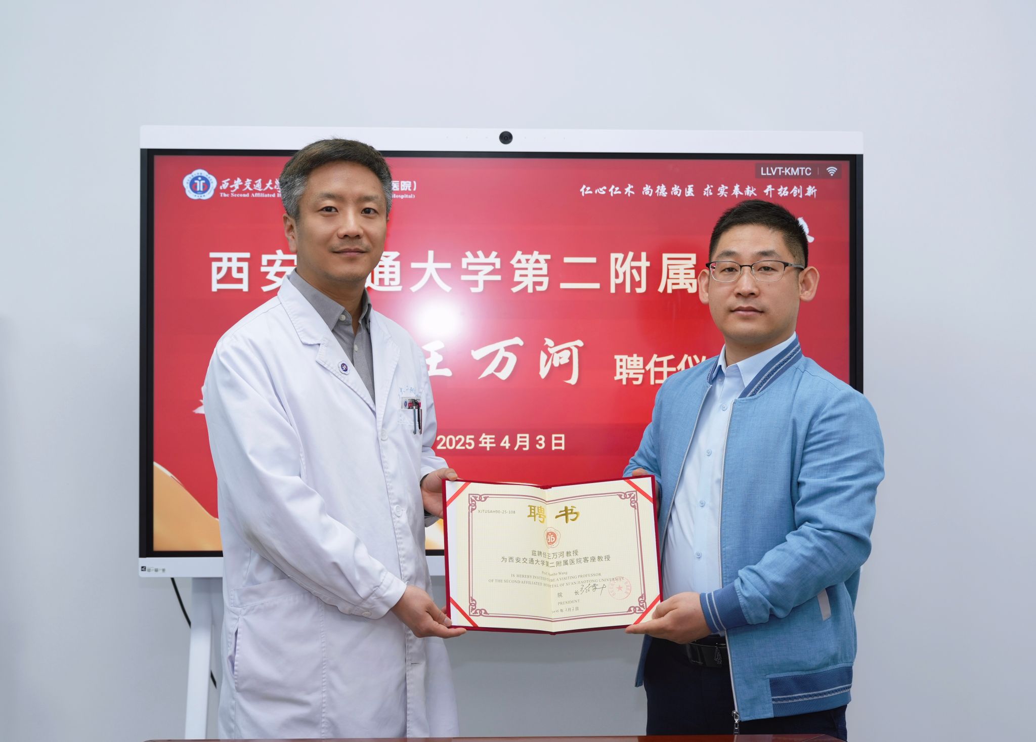 活动伊始,临床营养科主任贾庆安致辞后为王万河教授颁发聘任证书,正式聘任王万河教授为西安交通大学第二附属医院特聘客座教授。王万河教授是国际知名分析化学与生物医学交叉领域学者,2019年于香港浸会大学获得博士学位,随后在香港城市大学开展博士后研究工作。现为西北工业大学医学院独立PI,主要开展疾病诊断与食品环境分析平台开发、金属靶向药物发现等研究。在Angew. Chem. Int. Ed.、Med. Res. Rev.、Mol. Cancer、J. Med. Chem.等高水平期刊上发表论文100余篇,H-index为32。先后主持国家自然科学基金、国家重点研发计划子课题、陕西省自然科学基金、海南省重点研发计划等项目10余项。曾获得2023年、2017年“中国分析测试协会科学技术奖(CAIA奖)”,2023年“IAAM年度科学家奖章”等殊荣。