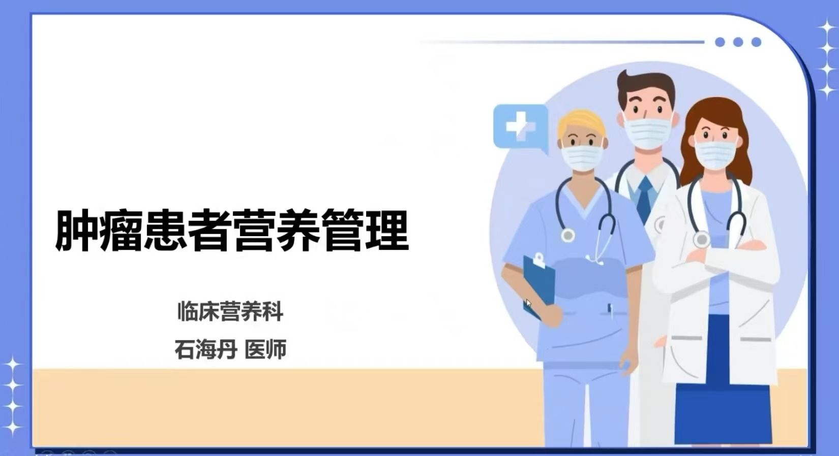 4月16日下午,临床营养科石海丹医师参与肿瘤内科大型健康科普宣教会,通过线上会议开展《肿瘤患者营养管理》的专题讲座,受众患者及家属80余人。讲座聚焦肿瘤与营养的关联性,强调营养不良对治疗及预后的危害,并系统讲解全程营养管理策略:治疗前通过高蛋白饮食、口服营养补充等方式做好营养储备;治疗中针对性应对食欲下降、口腔黏膜炎等副作用,推荐少食多餐、冷流质饮食等技巧;治疗后以均衡膳食预防复发,破除“饥饿疗法”“发物忌口”等误区,明确营养补充对提升免疫力、延长生存期的关键作用。石海丹医生以科学理论与实用技巧相结合,用通俗易懂的讲述,帮助患者了解营养干预在抗癌全程中的价值,使患者提高营养自我管理能力。
