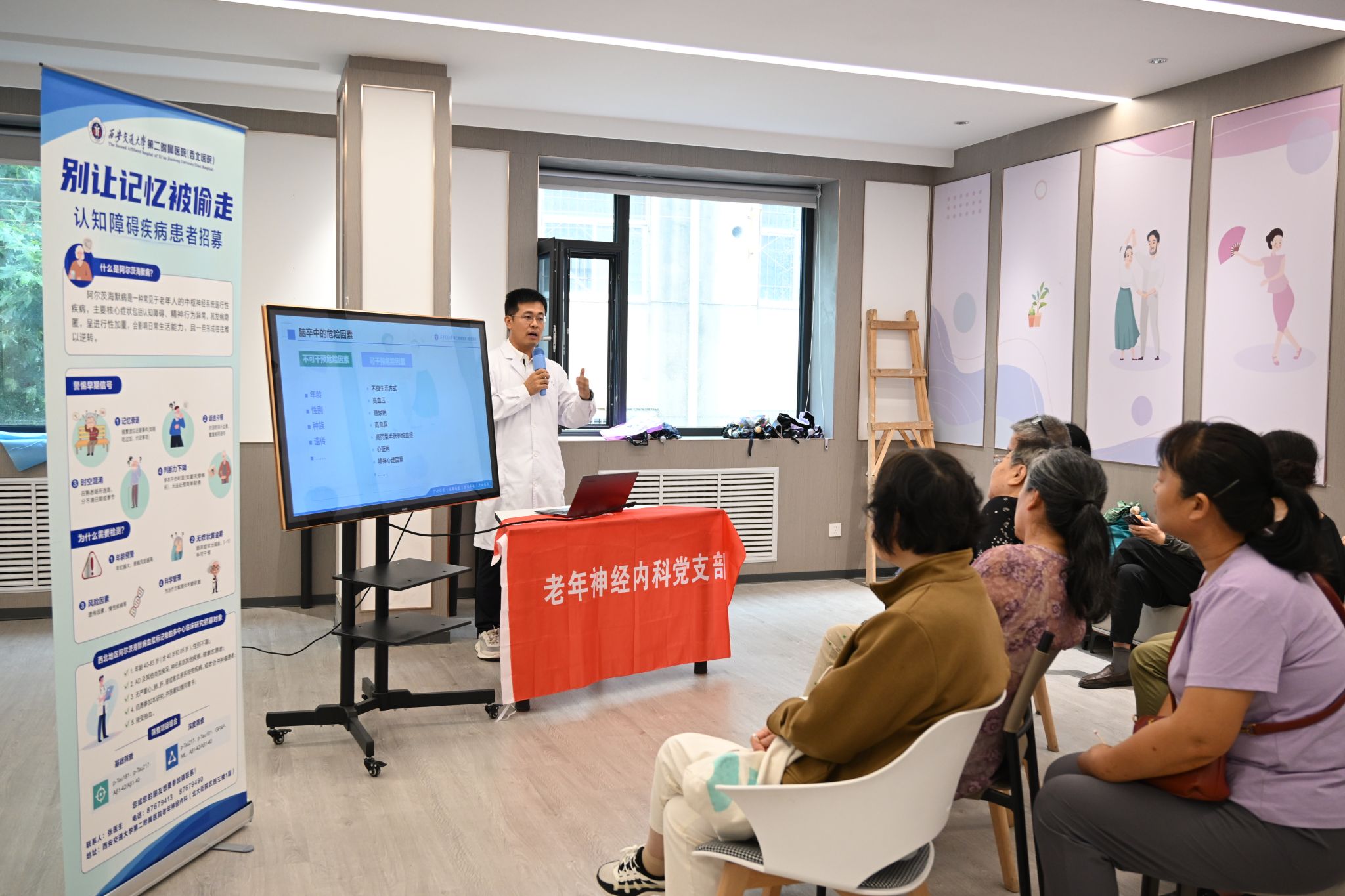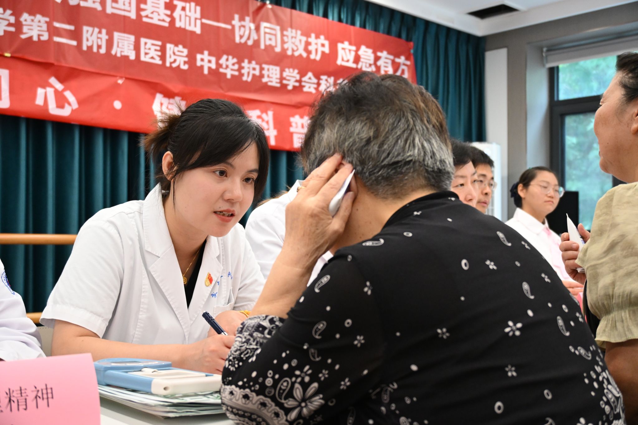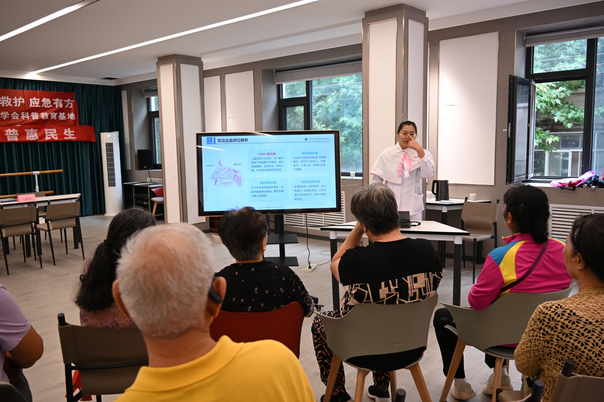 来自老年神经内科支部书记张有友医生首先带来了题为《守护“生命中枢”——脑卒中健康科普》的精彩讲座,用通俗易懂的语言讲解了脑卒中预防与保健知识,吸引了大量中老年居民驻足聆听;临床营养科石海丹医生现场为大家讲解减油、增豆、添奶的必要性及实操办法。接下来的急救技能培训更是气氛热烈,老年心血管内科副主任叶莎副教授通过模拟人现场演示,手把手指导居民掌握心肺复苏;耳鼻咽喉科陈勃言护师科普了鼻出血的正确处理方法,极大提升了居民在突发事件中的自救互救能力,完美契合了“协同救护,应急有方”的活动主题。