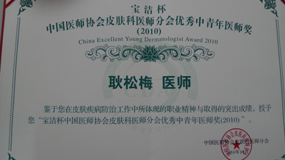 会议期间,由中国医师协会皮肤科医师分会专家委员会按照《 中国皮肤科医师奖评选章程》从全国各地所推荐的优秀中青年医师中进行遴选、评审,经全体委员无记名投票,有10名中青年医师获得“中国皮肤科优秀中青年医师奖”。我院耿松梅副主任医师荣获此奖,为我省及我院争得了荣誉,也扩大了我院在全国皮肤科学界的影响。本奖项是中国医师协会皮肤科医师分会为在全国皮肤科学界做出突出贡献的中青年医师设置的奖项。(皮肤科/文 张雷/图)