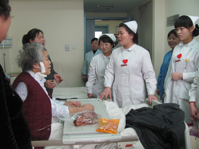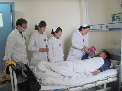2012年1月22日,在杨会总护士长、赵红莉、宋亚华护士长的带领下,消化内科护理人员分别对一病区、二病区共计26个病房30余位患者及家属送去了节日的问候,每一个病房,每一名患者,护士长都悉心问候,询问患者春节期间的生活需要, 同时为病人送上新春的问候,并将慰问品送到病人手中。患者及其家属都说虽然只能在医院过春节,但是由于有了这份问候,大家的心都温暖起来了,也都更加有信心与病魔抗争。