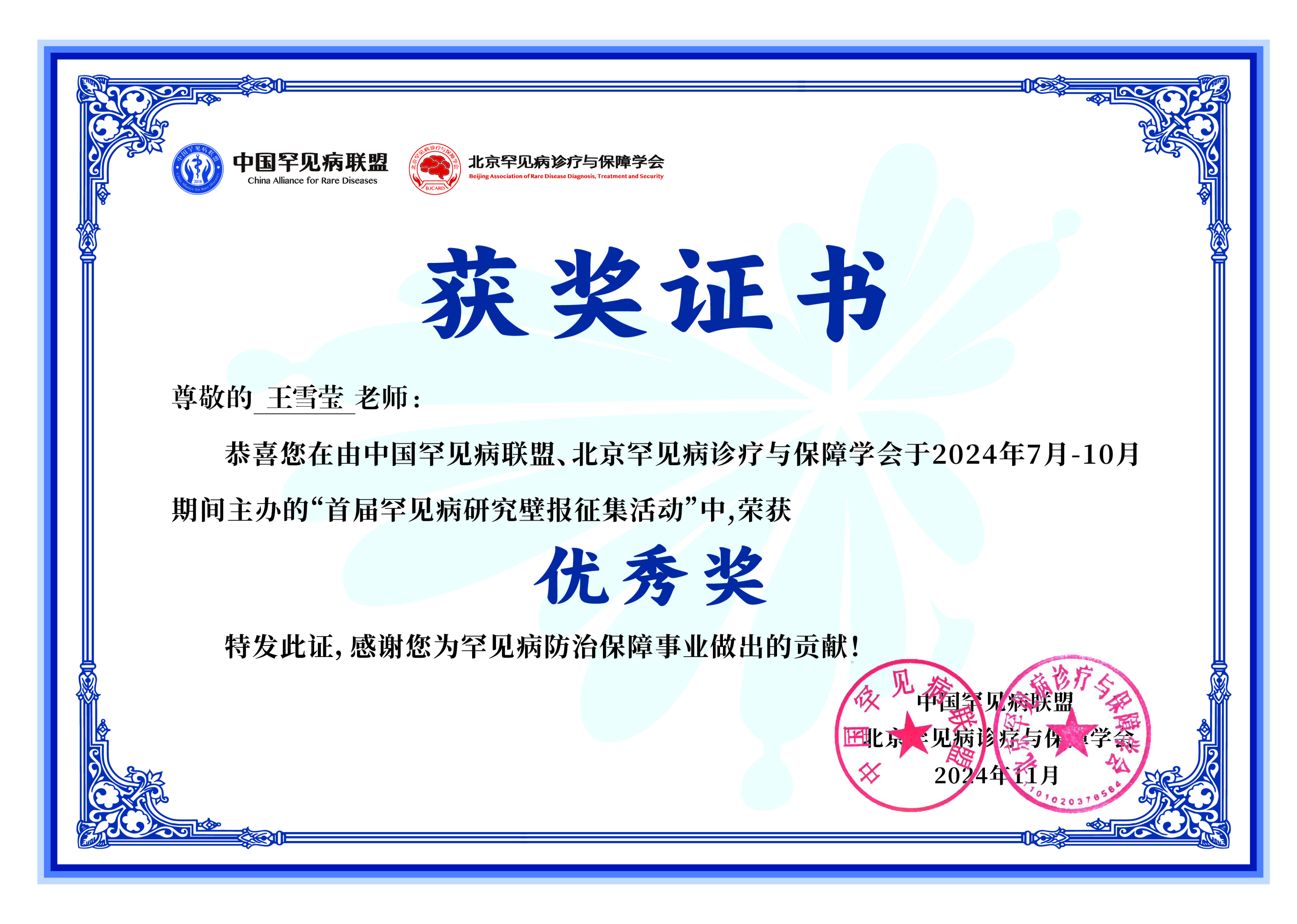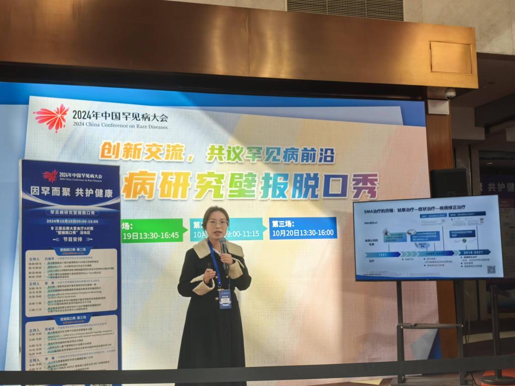 在2024年中国罕见病大会中,有一个特殊板块——首届罕见病壁报征集活动。此次壁报征集活动由中国罕见病联盟、北京罕见病诊疗与保障学会发起,全国140家医院/医学院校的数百个罕见病团队参与。活动历时4个月,共征集罕见病研究壁报400余份。我院小儿内科杨琳主任团队一直随访的脊髓性肌萎缩(SMA)患者队列研究中的关于诺西那生和利司扑兰联合治疗SMA的疗效及安全性研究部分结果,由团队骨干王雪莹医生收集并撰写为壁报投稿,此壁报获得大赛优秀奖。与此同时,由于壁报内容丰富,且有前沿及新颖性。大会还邀请团队做脱口秀在罕见病大会上进行展示,同时在线上直播。王雪莹医生代表科室及研究团队,就联合治疗的患者基本情况及长期随访结果以及呼吁更多的人关心、关爱罕见病患者做了精彩的脱口秀展示,受到了线上线下的好评。