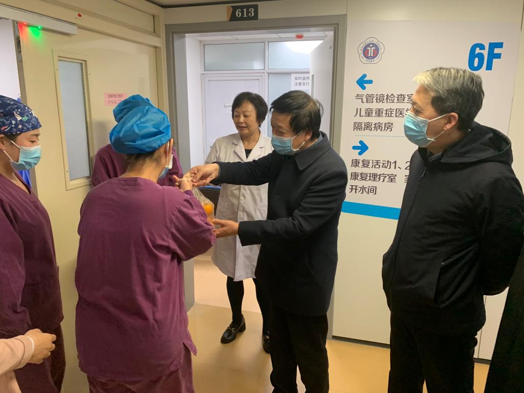 入秋以来,由于季节性与天气等因素,儿童流感、肺炎支原体感染等疾病高发,我院儿科门急诊量一直居高不下。气温骤降后,日均门急诊量已从10月初的210人次增加到了最高775人次,单次输液量也已突破400人次,加上肺炎支原体感染患儿日均输液时长均长达4-5小时,进一步增加了儿科就诊的压力。为保障患儿得到及时诊治,儿科全体医护人员尽职尽责,坚守一线,竭尽全力保障患儿高效、安全就诊。院方时刻牵挂着儿科一线职工们,11月13日下午,我院副院长张蓬勃,党委副书记、纪委书记滕文葆,工会主席陈海文以及党委办公室主任赵振峰一行来到儿科病区,走访、慰问连续奋战在一线的医护人员。