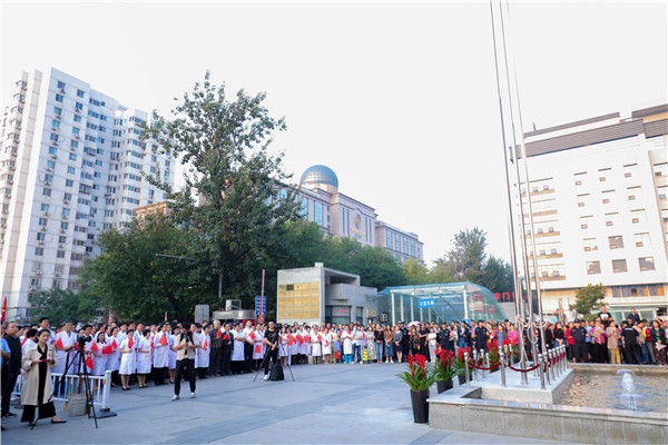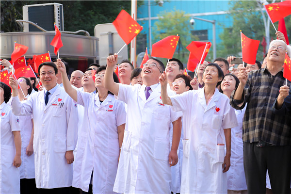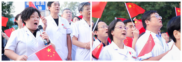 “五星红旗迎风飘扬,胜利歌声多么响亮,歌唱我们亲爱的祖国,从今走向繁荣富强……”升旗完毕,在场人员合唱《歌唱祖国》,同时,一面巨大的国旗从门诊综合住院大楼上缓缓落下,五星红旗飘扬在蔚蓝的天空,嘹亮的歌声响彻整个医院,挥舞的小红旗唤起中华儿女的自豪和向往。二附院人用歌声唱响对祖国的无限祝福、对卫生健康事业的赞美,全体医务工作者也必将不忘医者初心,德艺双修,教书育人,科研兴院,服务师生,服务社会,用过硬的本领满足人民群众对健康生活的美好向往,为实现中华民族伟大复兴的中国梦提供强有力的健康保障,在平凡的岗位上奏响新时代奋斗之歌,用我们的行动为国旗增辉。