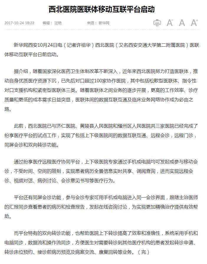 编者按:2017年10月24日,新华网以《西北医院医联体移动互联平台启动》为题报道了西北医院(又名西安交通大学第二附属医院)医联体移动互联平台启动情况。