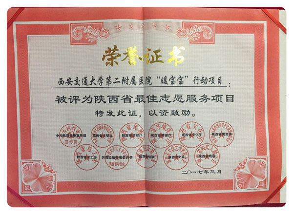 我院“暖宝宝”行动项目荣获2016年度“陕西省最佳志愿服务项目”。此次评选由陕西省委宣传部、省文明办、省民政厅、省环保厅、省文化厅、省国资委、省总工会、团省委、省妇联、省文联、省残联、陕西日报、陕西广播电视台等13个省级部门联合组织开展,评选工作自去年12月启动,经过组织申报、网络投票等环节,历时三个多月,于3月1日对30个志愿服务项目等进行了表彰。