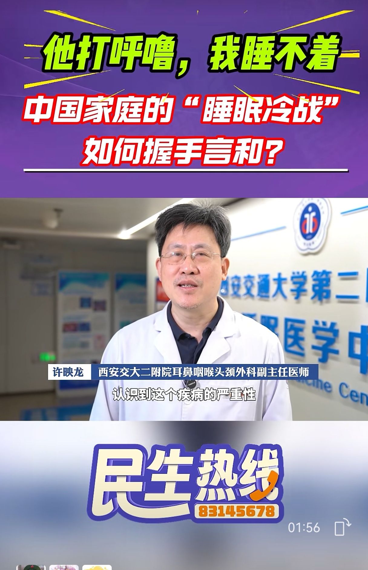 《陕西民生热线》栏目走进西安交通大学第二附属医院耳鼻咽喉头颈外科睡眠中心,针对“伴侣打呼噜导致另一方睡眠困扰”这一普遍存在却又常被忽视的“中国家庭睡眠冷战”民生问题,进行了深度采访与专题报道。面对镜头,睡眠中心的专家团队详细解读了“打呼噜”的成因,针对观众最关心的“该怎么办”的问题,栏目组跟随专家镜头,深入展示了睡眠中心的相关诊疗流程。此次通过民生热线栏目的广泛传播,希望能让更多“睡不着”的伴侣和“打呼噜”的当事人认识到问题的本质,积极寻求专业帮助,从而守护个人健康,提升家庭整体生活质量与幸福和谐,真正享受每一夜“优质睡眠”带来的美好生活。