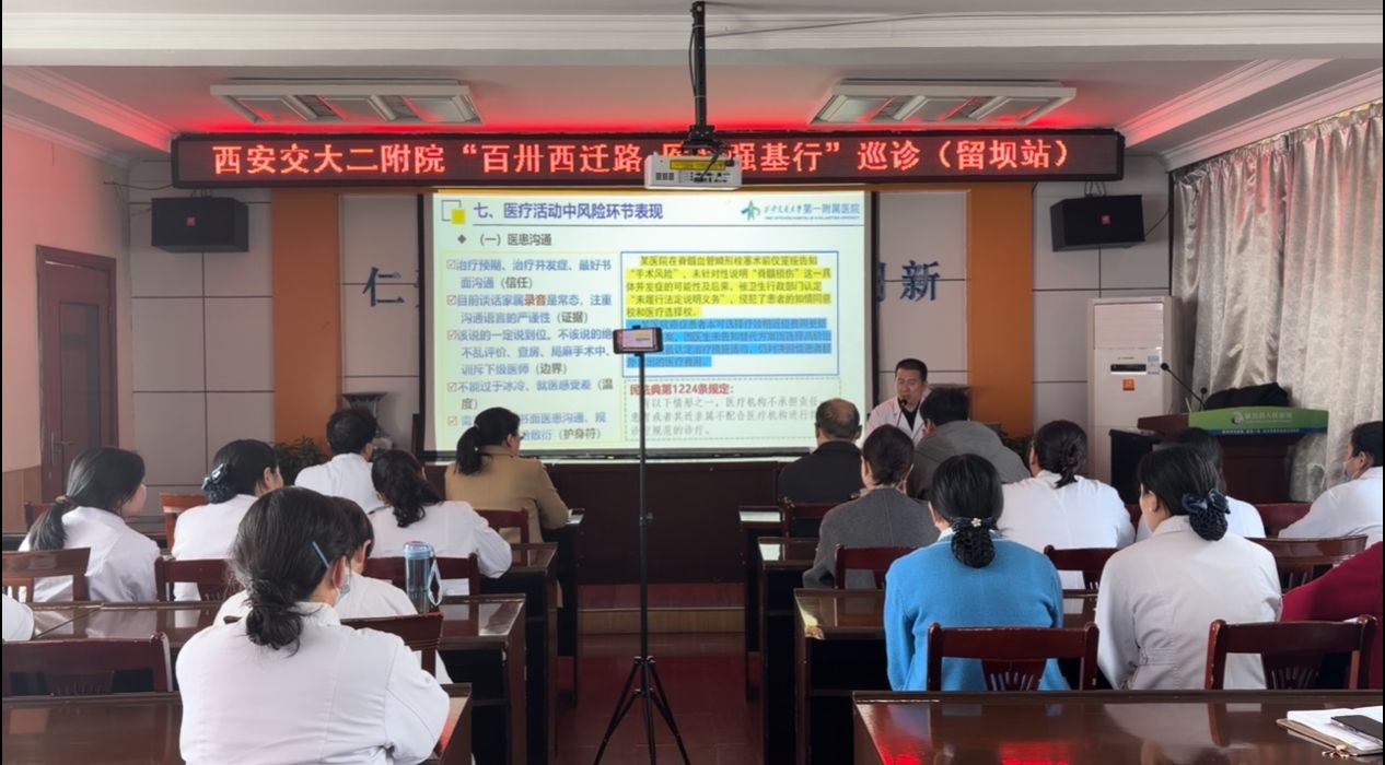 启动仪式后,专家团队随即开展义诊,针对山区常见病、多发病细致问诊、精准指导。部分专家深入病房开展教学查房与病例讨论,将诊疗规范融入现场带教。活动期间,交大一附院患者投诉与纠纷管理办公室主任买晓宇受邀为留坝县人民医院医护人员进行《做好风险防范,确保临床安全》专题讲座,围绕医患沟通与纠纷防范分享实践经验。