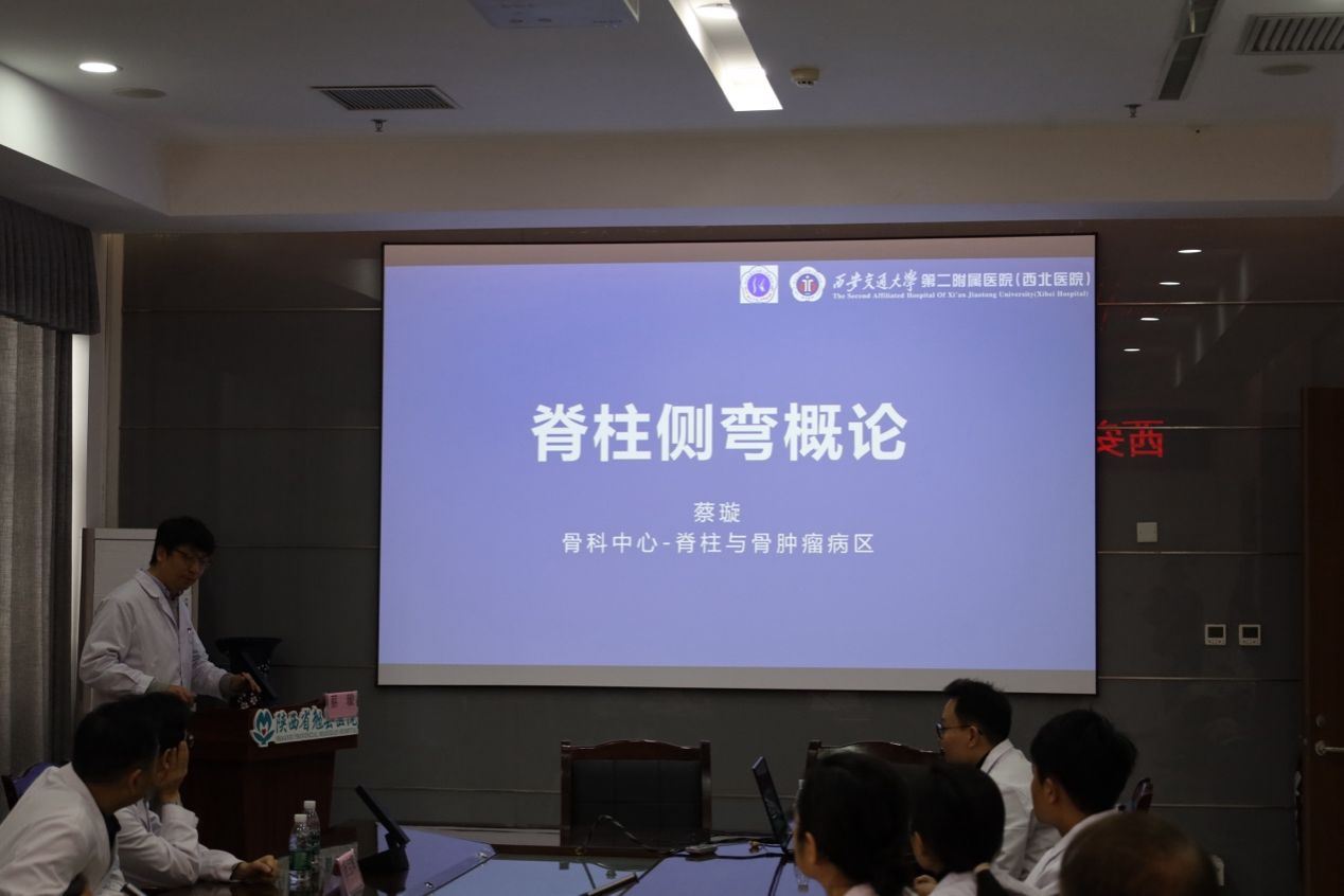 与此同时,学术讲座在会议室同步进行。王栋主任带来《UNSE/AUSS技术的创新应用》,展示脊柱微创领域的最新进展;蔡璇副主任分享《青少年特发性脊柱侧凸的分型及治疗策略》,为基层儿科与骨科的交叉诊疗提供新思路;杨宝辉副主任医师与秦杰副主任医师分别就骨质疏松性骨折的诊治进行深入探讨。