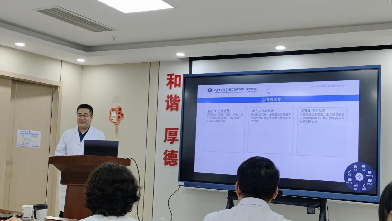 此次宣讲是中医科推动“中医药服务进科室”系列行动的重要一站,更是助力中西医协同“旗舰”医院内涵建设的重要举措。通过政策引领、技术赋能、科研驱动与护理落地,中医科与肝病科共同构建了“临床-科研-护理”三位一体的协同新范式。未来,双方将定期开展病例讨论、联合查房及科研合作,探索更多“西医精准诊疗+中医整体调理”的优势结合点,让肝病患者真正享受到疗效提升与体验优化的双重改善,为我院中西医协同高质量发展、深化中西医协同“旗舰”医院内涵建设贡献新的力量。