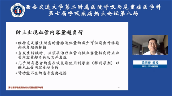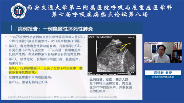呼吸重症专场,中华医学会呼吸病学分会委员、重庆医科大学第二附属医院王导新教授就糖皮质激素在流感、SARS、ARDS及新冠肺炎中的应用进行了详细讲解;中华医学会呼吸病学分会危重症学组副组长、中南大学湘雅医院潘频华教授讲授了顽固性高碳酸血症发生的病理生理机制,并介绍了体外CO2清除和ECMO在此类患者救治中的优势;中华医学会呼吸病学分会呼吸治疗学组副组长、危重症学组成员、四川大学华西医院梁宗安教授讲述了毛细血管渗漏的发生机制,并从原发和继发两个方面介绍了相应的诊治方法;中华医学会呼吸病学分会委员、河北医科大学第二附属医院阎锡新教授结合临床实践病例,阐述了床旁超声和HRCT在危重症患者诊治中的重要作用;我院呼吸与危重症医学科方萍教授结合最新研究进展,就重症患者炎症因子风暴的发生、识别及处理做出了精彩报告;我院呼吸与危重症医学科宁璞医生分享了一例重症肺炎伴发脓毒血症及多器官功能障碍的临床案例,强化了危重症患者救治中细致、规范开展临床工作的重要性。