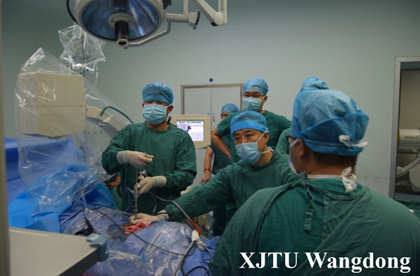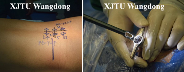 27岁的任先生受腰椎间盘突出症困扰一年有余,一年前开始出现左下肢抽痛,疼痛从左侧臀部向大腿、小腿后部放射,久坐、行走超过500米即诱发疼痛,严重影响日常生活和工作,备受折磨。经保守治疗、静养,症状不能缓解。曾于多家医院就诊,医生均建议行开放手术治疗,但开放手术的大切口、大创伤令任先生望而却步。最后经多方打听,慕名来我院就诊。与患者沟通了解到其希望用最小的创伤解除病痛的意愿后,经过详细的询问病史、查体、影像学检查,王栋教授认为患者为腰4/5、腰5/骶1双节段巨大、宽基底椎间盘突出,单纯的镜下椎间盘切除减压不能完全解决患者的问题,而且容易导致术后节段不稳、复发。经过系统的手术风险评估,王栋教授决定为患者进行脊柱内镜下减压、融合手术。入院后,完善患者术前检查,王栋教授、赵波、秦杰副教授治疗组根据患者临床资料制定了详细的治疗计划,对手术入路、术中骨性结构减压范围、神经松解方案、椎间隙和终板的内镜下处理、椎间融合器的植入方式和合理植入位置进行了术前计算机手术模拟,保证手术微创且万无一失。入院后第3天行全麻下全脊柱内镜下腰椎间盘摘除减压+椎间融合器融合内固定术,应用Joimax脊柱内镜系统,顺利完成手术,术中出血约50ml,术后臀部和下肢症状消失,第二天下床活动,住院5天,情况良好。