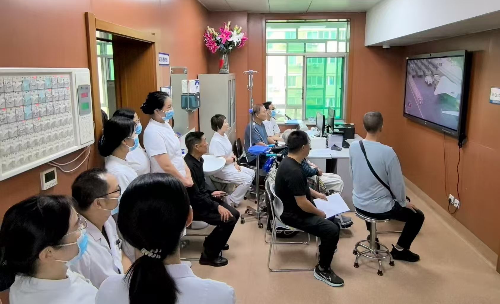 观看现场,气氛庄重而热烈。当雄壮的国歌声响起时,大家不约而同齐声唱着,眼中饱含着激动与自豪的泪花。大家目不转睛观看着天安门前的恢弘场面,铿锵有力的步伐、英姿飒爽的官兵、气势磅礴的装备方队,逐一映入眼帘。其中两位94岁高龄的住院患者张老先生和戴老先生,均是坐着轮椅在医护及家人的陪护下,观看了全程阅兵仪式,令人肃然起敬。现场观看者纷纷表示:“看到如今国家这样强大,军队这样威武,国器如此先进,实在是令人骄傲与自豪,何其有幸,生于华夏,更要珍惜今天的美好生活,同时在自己的工作岗位上兢兢业业,为祖国做贡献!”。冯建军主任激动地说:“在这个特殊的日子里,能和我们的患者、同事们,尤其我们两位战争年代过来的高龄老人一起观看阅兵,意义非凡。这不仅是一次爱国主义教育,更极大地增强了我们的民族自豪感和凝聚力。我们将把这种精神力量转化为做好本职工作的强大动力,以更精湛的医术、更优质的服务守护人民健康。”护士长李婉妮表示:“看到官兵们整齐划一、坚毅向前的画面,我深刻感受到了什么是纪律、什么是担当。在今后的护理工作中,我们要更加注重细节、追求卓越,给予患者最贴心、最专业的护理。”