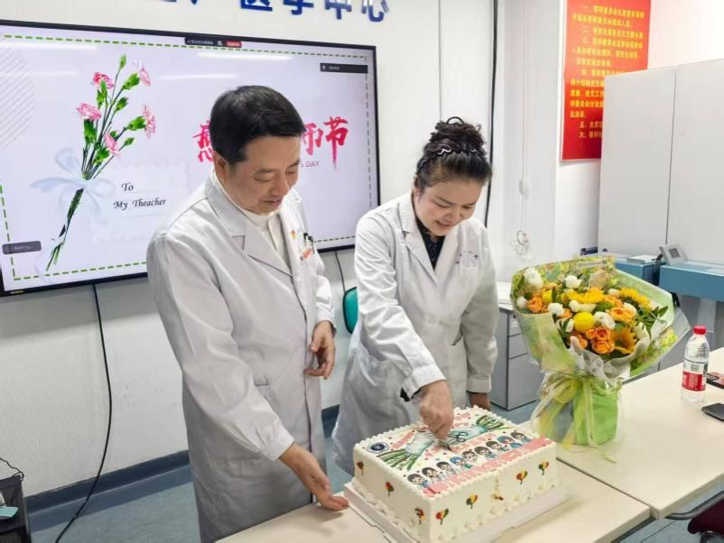 活动伊始,一场温馨的教师节庆祝仪式拉开帷幕。考虑到科室成员分布在两院区的实际情况,党支部特意搭建线上联动平台,让两院区医务人员同步参与、共享温情,节日蛋糕上 “我们永远在一起” 的字样格外醒目,传递着对科室前辈的敬意。