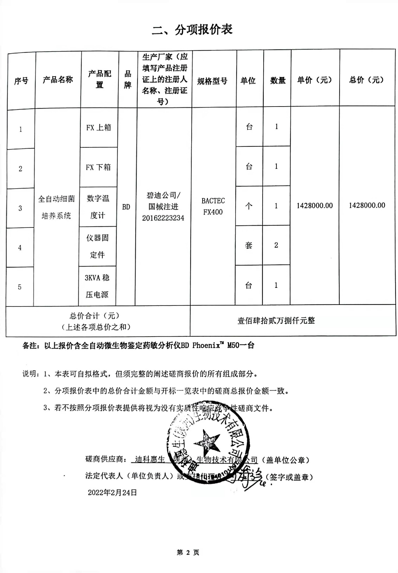 1 | 迪科惠生(陕西)生物技术有限公司 | 全自动细菌培养系统 | BD | BACTECFX400 | 1 | 928000 |