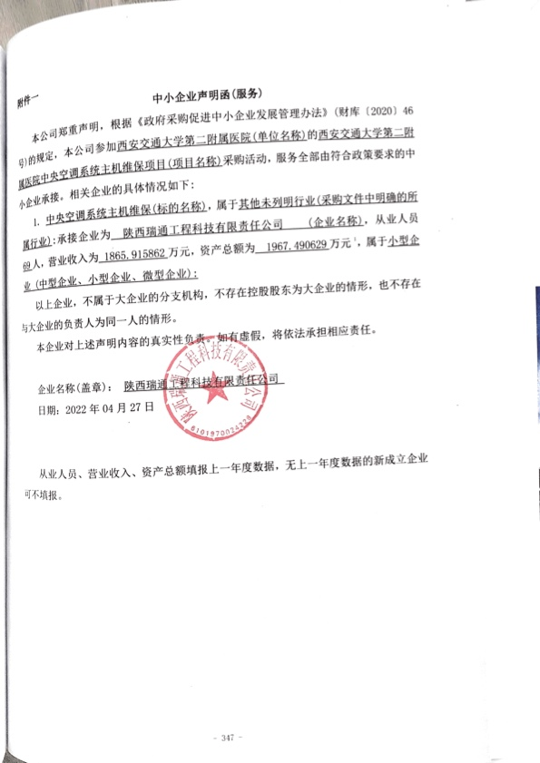 1 | 陕西瑞通工程科技有限责任公司 | 中央空调系统主机维保 | 东楼(原儿科楼)、干部楼、综合大楼、西二楼、西一楼、东妇儿楼、西门诊楼中央空调系统主机维保,维保范围还包括所保养设备相关联的所有电气元件以及从配电柜至设备的电线电缆,设备配件与机组的软件匹配工作等;机房所有管道及阀门的保养及维修 | 1)、在维保期内,驻守一名主机维保专业人员在岗(制冷季驻守时间:8:00-22:00,其余时间:8:00-18:00)设备出现故障后须及时解决问题;若出现紧急故障时,需在半小时内到达现场并立即解决故障,确保设备正常运行,如需多人配合作业,乙方自行安排人员。 | 自合同签订之日起3年 | 满足国家及行业相关标准 |