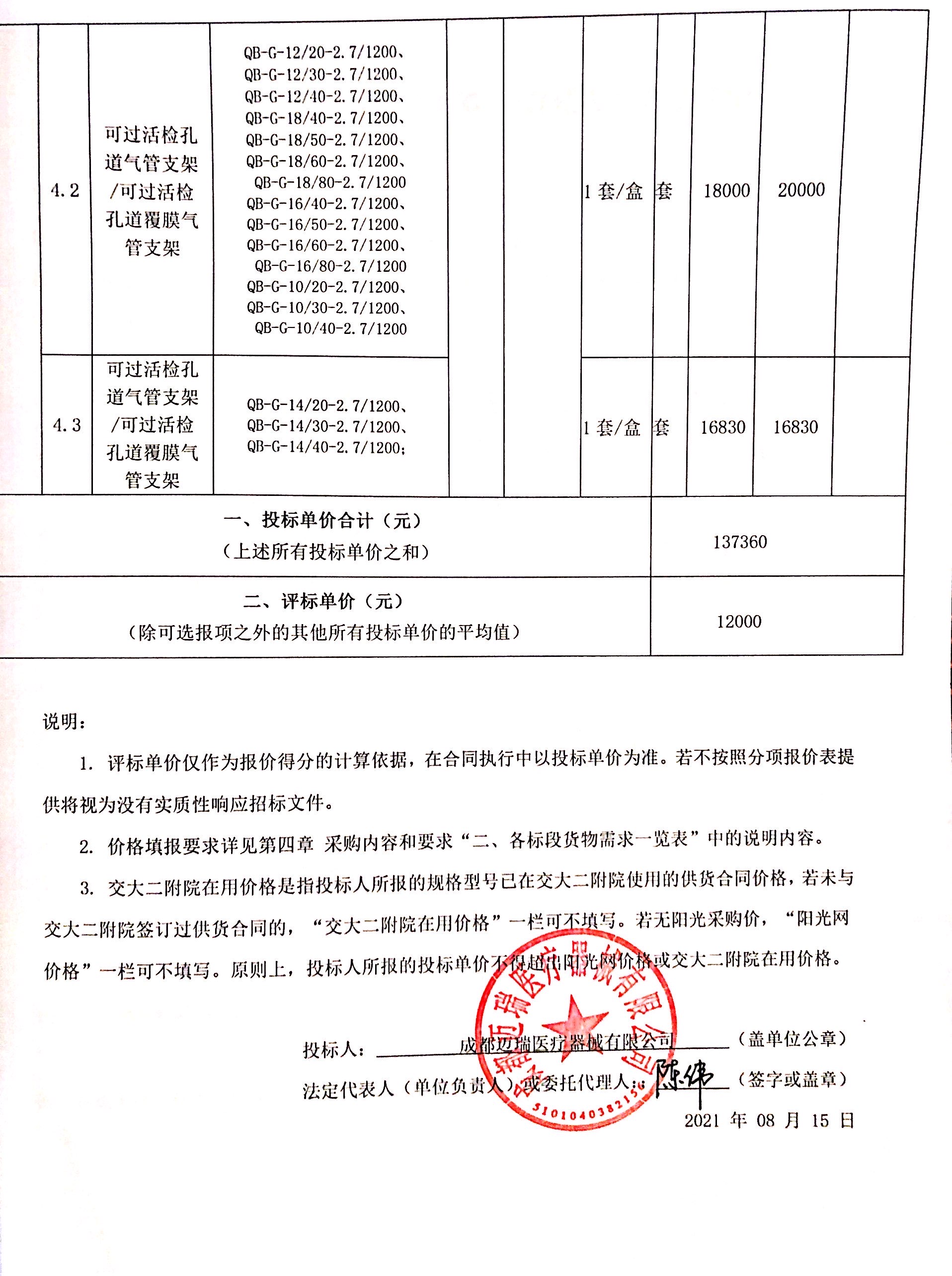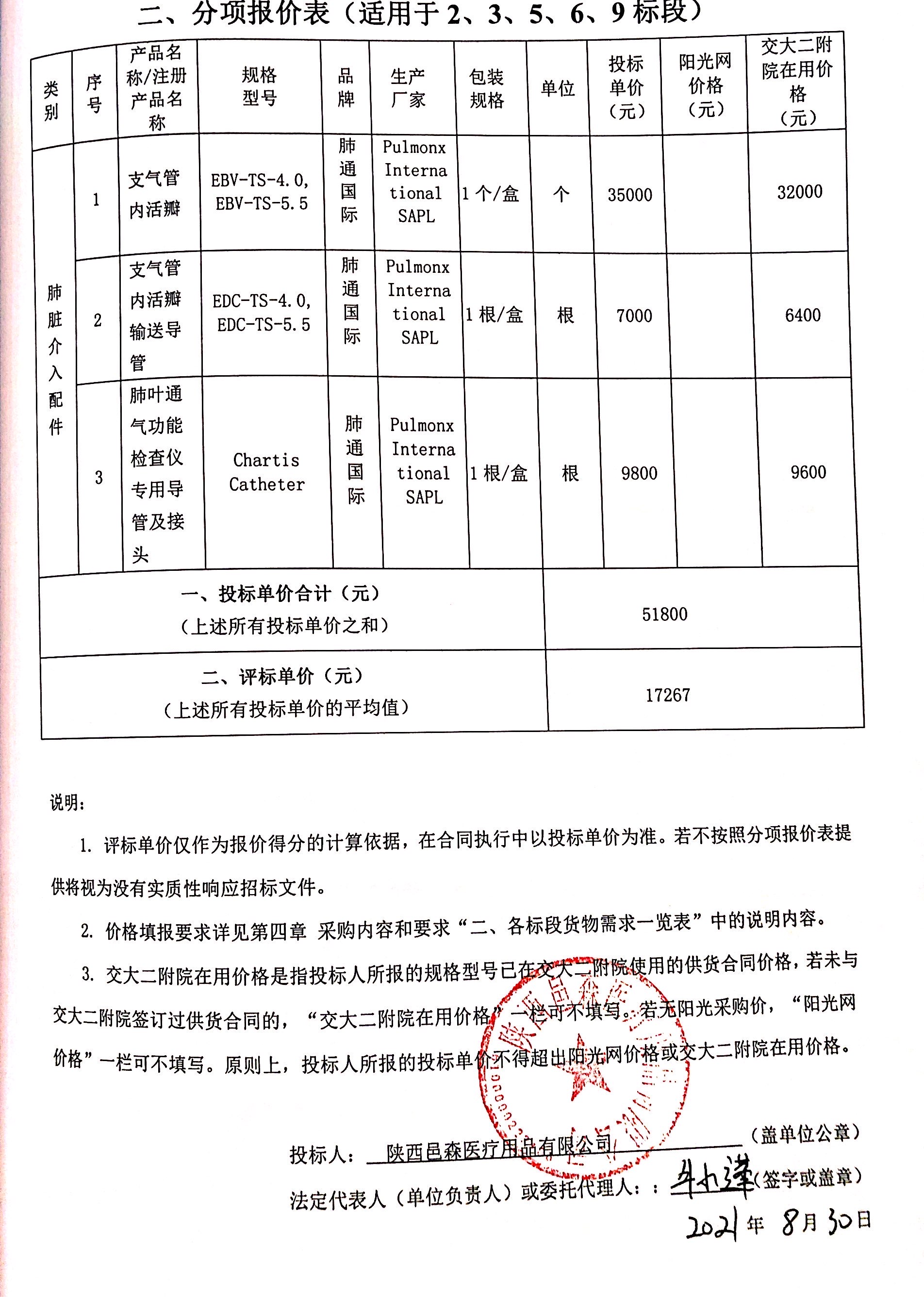 1 | (3标段)陕西邑森医疗用品有限公司 | 支气管热成形导管 | 波科 | 详见澄清函 | 详见澄清函 | 详见澄清函 | |