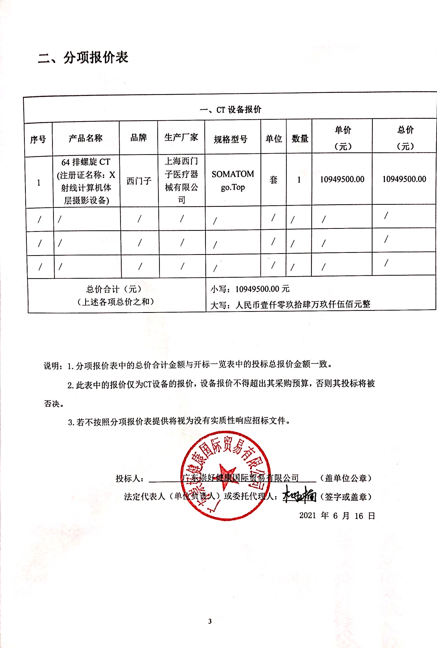 1 | 广东崇好健康国际贸易有限公司 | 64排螺旋CT(注册证名称:X射线计算机体层摄影设备) | 西门子 | SOMATOM go.Top | 1套 | 10949500.00 |